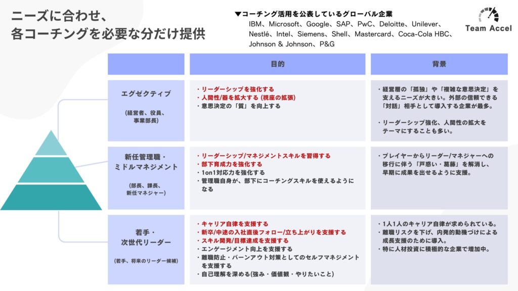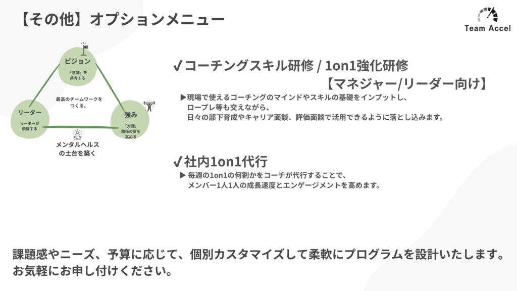 ▶︎3分チームサーベイ、各種ワークショップ、コーチング、研修は、いずれも単発実施も可能です。